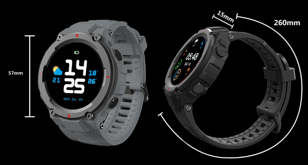 As you see in the picture above! The new Model 3 smartwatch got a powerful Military design that looks stylish, fashionable, and calmly corresponding to all outdoor scenes. Measuring 57.5*52*15mm and weighing about 48g. The body is made of strong material while the strap is available in silicone. Regarding the display screen! The new wearable has a 1.28 inch IPs full round HD screen with 240*240 resolution.