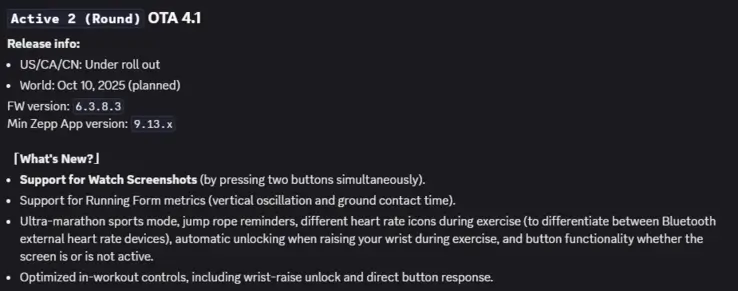The software version 6.3.8.3 is currently being distributed to users of the Amazfit Active 2 (Round) smartwatch in specific regions, including the US, Canada, and China. The company shared a recent announcement on Discord, confirming that the new firmware is scheduled for a global rollout to all remaining users starting from October 10th.