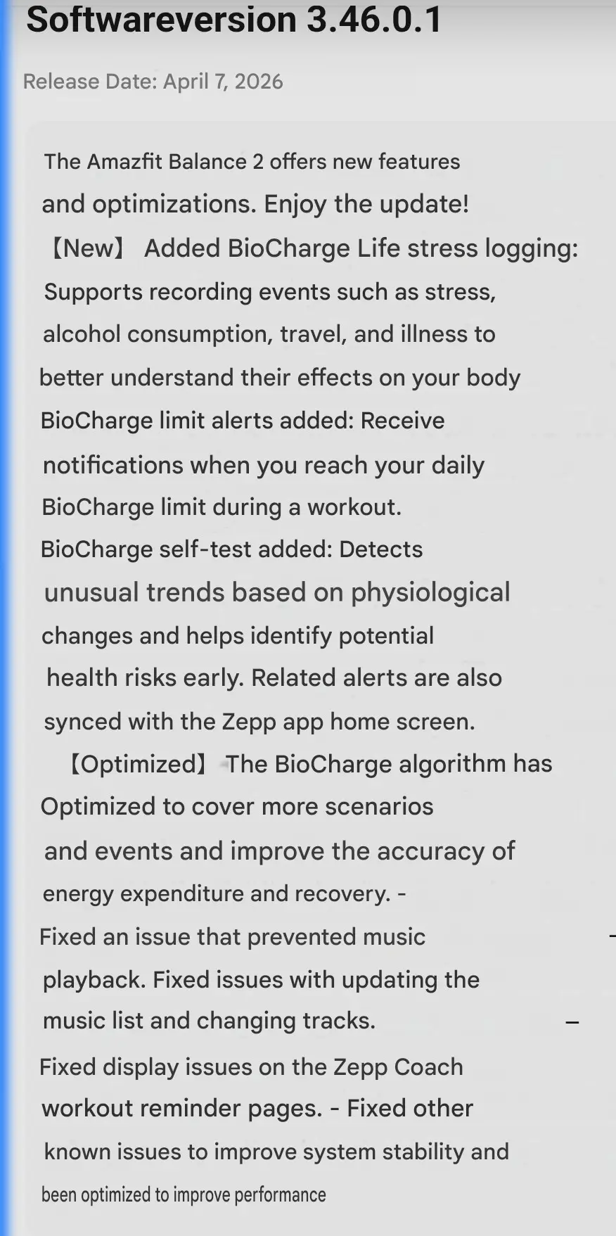 Data synergy is a major focus of version 3.46.0.1. All BioCharge-related alerts are now designed to sync instantly with the Zepp Health app homepage, ensuring your most critical health data is the first thing you see when opening your phone.
