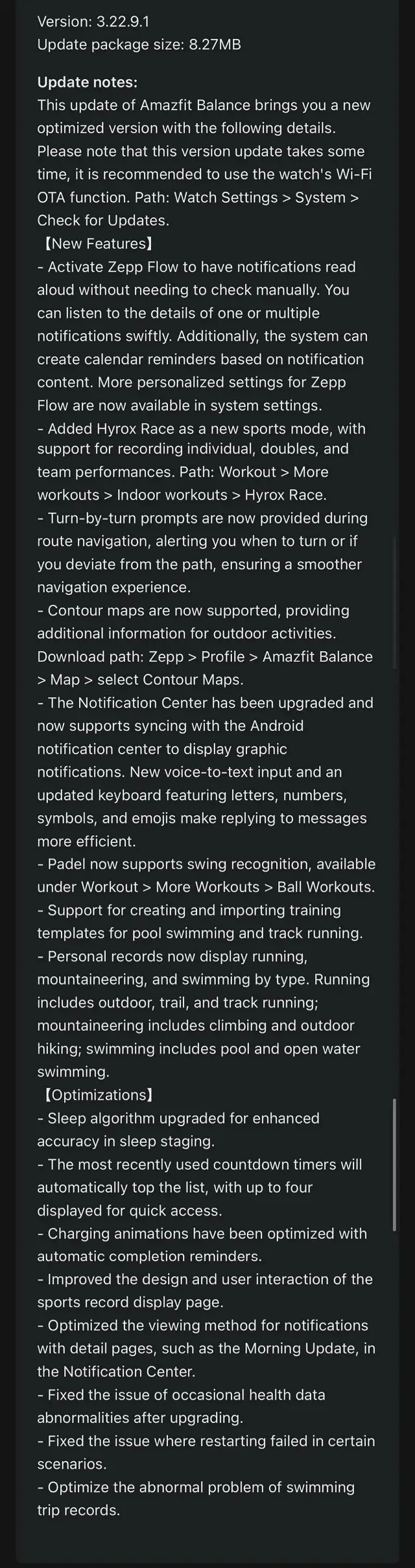 To update your Amazfit Balance to version 3.22.9.1, simply use the watch’s Wi-Fi OTA function. Navigate to Watch Settings > System > Check for Updates to initiate the download and installation process.