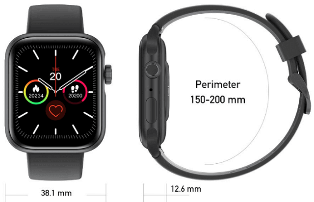 As you see in the picture above, This new H10 watch comes in a square shape that looks stylish, fashionable, and fits men and women. Measuring 44*38.1*12.6mm and weighing about 50g. There is one physical button on the right side of the case. It is responsible for the function of turning on the running back. The reverse side of the device received a typical configuration – there are magnetic contacts for charging and a heart rate sensor.