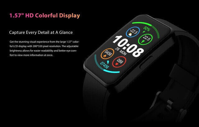 The smartwatch body is made out of Aluminum alloy with Pc plastic while the strap is available in silicone. Regarding the display screen! This Blackview R5 smart band has a 1.57inch Large TFT touch screen curved with 3D glass created with a resolution of 200 x 320 pixels. This wearable is also packed with a variety of watch faces and is available in black, orange, and pink colors.