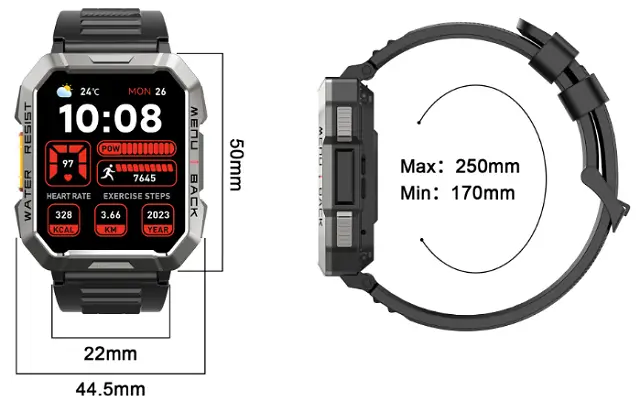 As you see in the photo above, This new Blackview W60 watch got a square design that looks stylish, rugged, and fits men and women. Measuring 50*44.5*14.5mm and weighing about 60g. There are two physical buttons on the right side of the case, It is responsible for the function of the turn on/off. The reverse side of the device received a typical configuration – there are magnetic contacts for charging and a heart rate sensor.