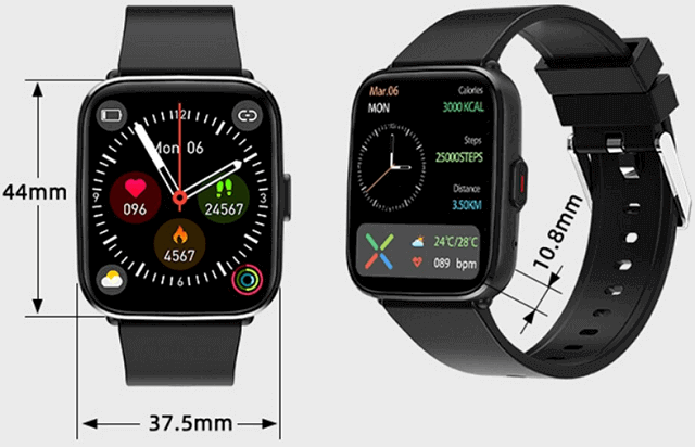 As you see in the photo above, This new G12 Pro watch comes in a square shape that looks stylish, sporty, and fits men and women. Measuring 44*37.5*10.8mm and weighing about 38g. There is one physical button on the right side of the panel. It is responsible for the function of turning on the running. The reverse side of the device received a typical configuration – these are magnetic contacts for charging and a heart rate sensor.
