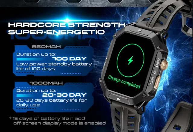 Pros: Rugged design, Large AMOLED screen, 100 Kinds of sports modes, Multi kinds of health monitoring, Bluetooth calling, Suitable for swimming, Huge Battery