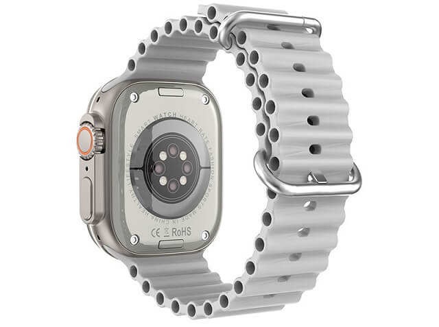 As you see in the picture above, this new DT Ultra 2 watch got a square design that looks stylish, fashionable, and similar to the Apple Watch Ultra. Measuring 49*43*11.5mm and weighing about 46g. There are two physical buttons on the right-side panel. It is responsible for the function of the turn on/off. The reverse side of the device received a typical configuration – there are magnetic contacts for charging and a heart rate sensor.
