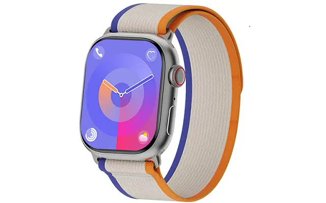 As you see in the picture above, this new X9 Call 4G watch got a square design that looks stylish, fashionable, and similar to the Apple Watch Series 9. Measuring 49*43*11.5mm and weighing about 46g. There are two physical buttons on the right side of the case. while on the other side, you will find a SIM card input. The reverse side of the device received a typical configuration – there are magnetic contacts for charging and a heart rate sensor.