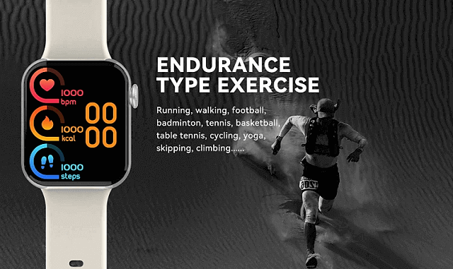 As you see in the picture above, This new E700 watch comes in a square design that looks stylish, sporty, and fits men and women. Measuring 44*37*11mm and weighing about 50g. There is one physical button on the right side of the case. It is responsible for the function of turning on the running back. The reverse side of the device received a typical configuration – there are magnetic contacts for charging and a heart rate sensor.
