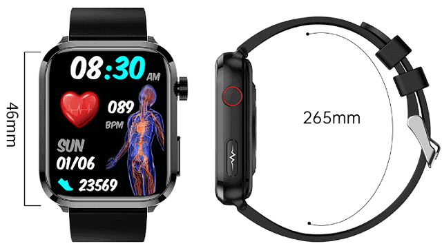 As you see in the photo above, This new ET210 watch got a square design that looks stylish, fashionable, and fits men and women. Measuring 46*39*11.6mm and weighing about 50g. There are two physical buttons on the right side of the panel. It is responsible for the function of turning on the running as well as ECG measurement. The reverse side of the device received a typical configuration – there are magnetic contacts for charging and a heart rate sensor.