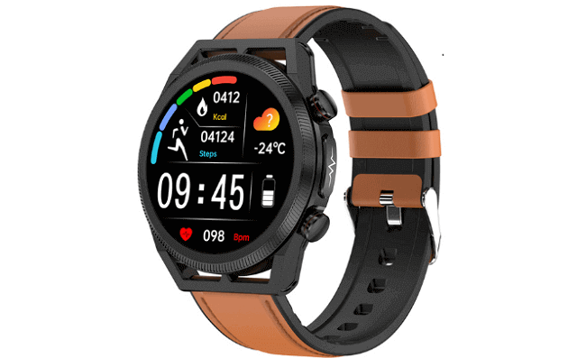 The ET310 smartwatch body is made of zinc alloy while the strap is available in silicone and leather. Regarding the display screen! This ET 310 smart watch has a 1.39-inch large TFT touchscreen curved with 2.5D glass and is created with a resolution of 360 x 360 pixels. This wearable is also packed with a variety of watch faces and is available in black, red, blue, and brown colors.