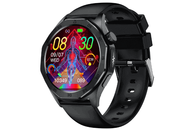 As you see in the photo above, This new ET480 watch got a circular design that looks stylish, fashionable, and fits men and women. Measuring 46*46*11mm and weighing about 50g. There are three physical buttons on the right side of the panel. It is responsible for the function of turning on the running as well as ECG monitoring. The reverse side of the device received a typical configuration – there are magnetic contacts for charging and a heart rate sensor.