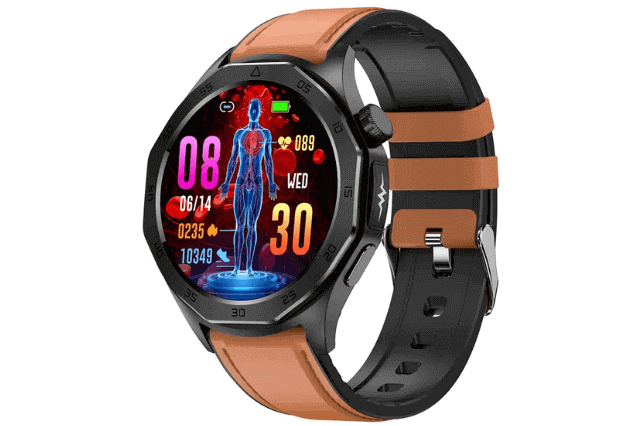 The ET480 smartwatch body is made of zinc alloy while the strap is available in silicone and leather. Regarding the display screen! This ET 480 smart watch uses a 1.43-inch large AMOLED touchscreen that supports an always-on display and is created with a resolution of 466 x 466 pixels. This watch is also packed with a variety of watch faces and is available in black, red, blue, and brown colors.