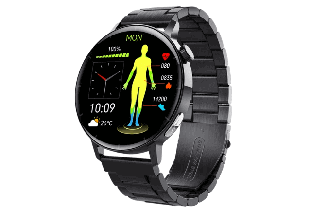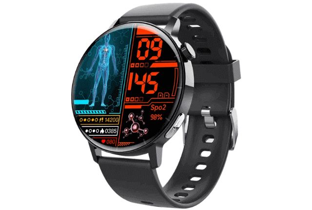 The F67 Pro smartwatch body is made out of zinc alloy while the strap is available in silicone, steel, and metal. Regarding the display screen! This F67Pro smart watch has a 1.41-inch large IPS touchscreen curved with 2.5D glass and is created with a resolution of 360 x 360 pixels. This wearable is also packed with a variety of watch faces and is available in black color.