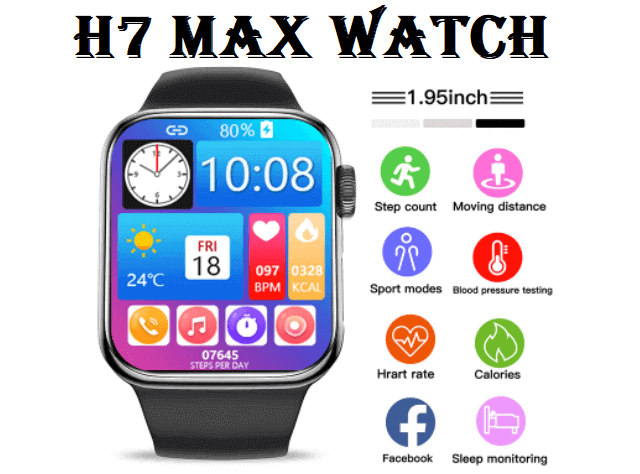The H7 Max smartwatch body is made out of zinc alloy while the strap is available in silicone. Regarding the display screen! This H7 Max smartwatch has a 1.95-inch Large IPS touch screen curved with 2.5D glass and created with a resolution of 360 x 420 pixels. This wearable is also packed with a variety of watch faces and is available in black, white, and pink colors.