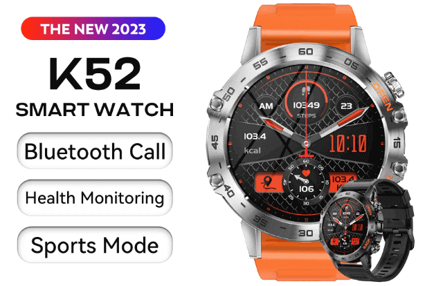 The Hifar K52 smartwatch body is made of zinc alloy while the strap is of silicone. Regarding the display screen! This K52 smart watch has a 1.39-inch large IPS touchscreen curved with 2.5D glass and is created with a resolution of 360 x 360 pixels. This wearable is also packed with various watch faces and is available in black and orange colors.