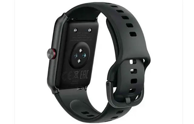 As you see in the picture above! This Honor Choice Band got a rectangular shape that looks sporty, stylish, and fits men and women. Measuring 48.5*31.7*10mm and weighing about 18.5g. There are two buttons on the right side of the case, It is responsible for the function of turning on the running back. The reverse side of the device received a typical configuration – there are magnetic contacts for charging and a heart rate sensor.