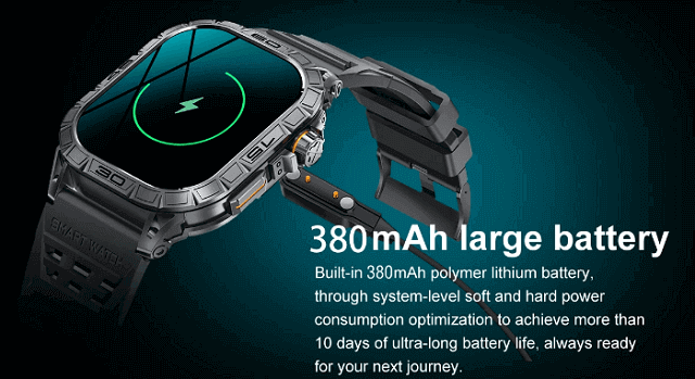 In addition to the features mentioned above. The K63 watch has a speaker and microphone that allow you to make calls directly via the smartwatch. Additional features are an SPO2 Blood oxygen monitor, Blood pressure monitor, +100 sports modes, call and message reminder, Breath Training, Anti-lost, Brightness control, timer, stopwatch, Bluetooth 5.0…etc. This smartwatch has a 380 mAh battery capacity with 5-10 days of normal usage and 20 days of standby time.