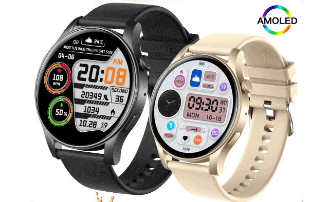 The KC88 smartwatch body is made out of zinc alloy while the strap is available in silicone. Regarding the display screen! This KC 88 smart watch has a 1.43-inch large AMOLED touchscreen curved with 2.5D glass and is created with a resolution of 466 x 466 pixels. This wearable is also packed with a variety of watch faces and is available in black, pink, and gold colors.