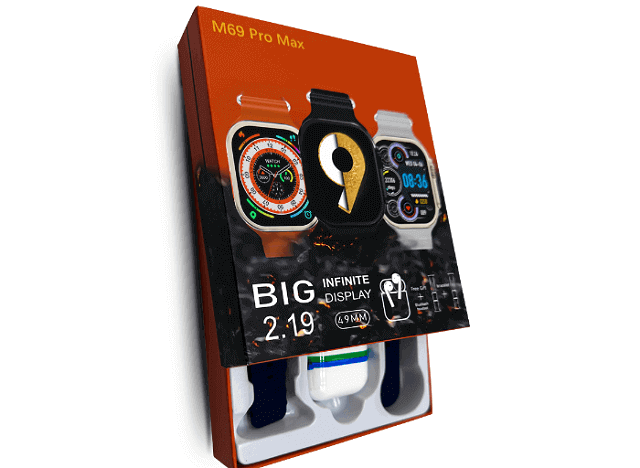 The M69 Pro Max smart watch body is made of zinc alloy while the strap is available in silicone. Regarding the display screen! This M69Pro Max smartwatch uses a 2.19-inch Large IPS touchscreen curved with 2.5D glass and is created with a resolution of 320*320 pixels. This gadget is also packed with a variety of watch faces and is available in black, white, pink, yellow, blue, and orange colors.