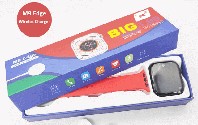 The M9 Edge smartwatch body is made of zinc alloy while the strap is available in silicone. Regarding the display screen! This M9Edge smart watch uses a 1.99-inch Large IPS touchscreen curved with 2.5D glass and is created with a resolution of 320*240 pixels. This Apple Watch Series 8 clone is also packed with more than 500 watch faces and is available in black, pink, blue, green, red, and white colors.