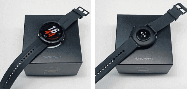 As you see in the photo above, This new Maimo R smartwatch comes in a circular shape that looks sporty, fashionable, and fits men and women. Measuring 46.5*46.5*10.8mm and weighing about 44.7g. There is one physical button on the right side of the case. It is responsible for the function of turning on or running back. The reverse side of the device received a typical configuration – there are magnetic contacts for charging and a heart rate sensor.