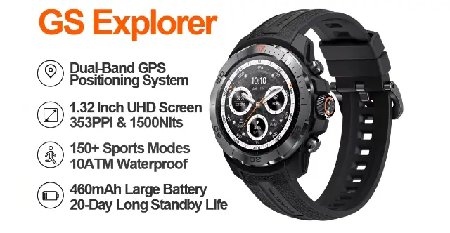 In addition to the features mentioned above, The Explorer Watch also can track up to 150 sports activities including walking, running, cycling, climbing, swimming, football, basketball…etc. Additional Features are an SPO2 Blood oxygen monitor, GPS, Compass, Glonass, Braith training, Call or message reminder, App notification, Bluetooth 5.3, and more. This watch has a 460mAh large battery that can last 10-20 days with normal usage and 60 days with basic watch mode.