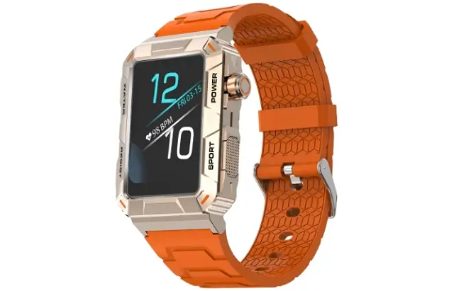The MT88 smart watch body is made of zinc alloy while the strap is of silicone. Regarding the display screen! This MT 88 smartwatch has a 1.57-inch Large IPS touchscreen curved with 2.5D glass and is created with a resolution of 200 x 320 pixels. The device is also packed with various watch faces and is available in black and orange colors.