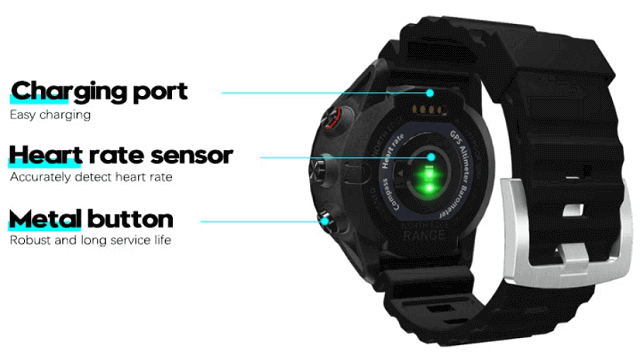 As you see in the photo above. This Range 5 watch comes with a business sport design with a tough appearance, It looks stylish, fashionable, and suitable for men and women. Measuring 50*50*16.5mm and weighing about 78g. There are three buttons on the right side of the case. It is responsible for the function of turning on the running back. The reverse side of the device received a typical configuration – these are magnetic contacts for charging and a heart rate sensor.