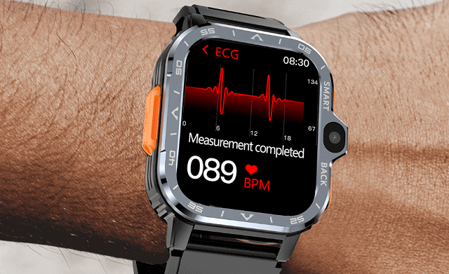 As you see in the picture above. This new PGD 4G smartwatch got a square design that looks stylish, rugged, and fits men and women. Measuring 51*43*13mm and weighing about 85g. There are two physical buttons on the right side of the case and between them an 8MP +2MP dual camera. The reverse side of the device received a typical configuration – these are magnetic contacts for charging and a heart rate sensor.