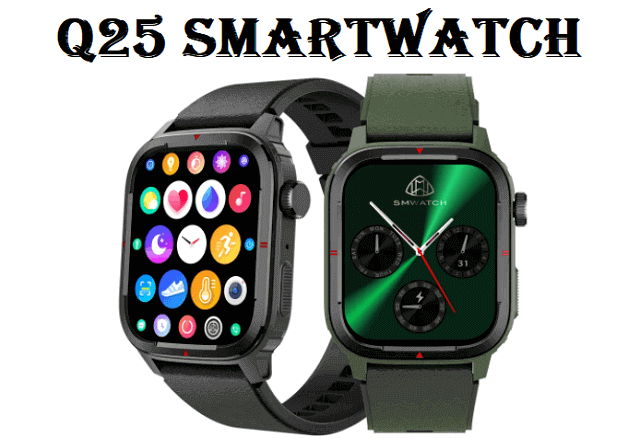 The Q25 smartwatch body is made out of zinc alloy while the strap is available in silicone. Regarding the display screen! This Q25 smart watch uses a 1.7-inch Large touch retina screen created with a resolution of 240 x 280 pixels. This fitness tracker is packed with various watch faces and is available in black, green, and grey colors.