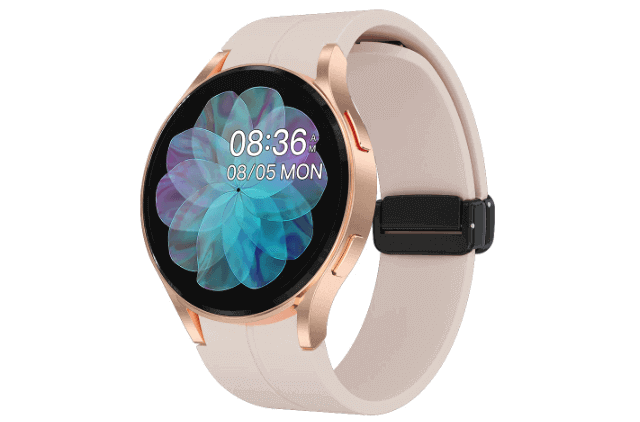 As you see in the picture above, This new R6 Pro Max watch got a circular design that looks stylish, fashionable, and similar to the Galaxy Watch 6. Measuring 49*41.5*11.8mm and weighing about 50g. There are two physical buttons on the right side of the case, It is responsible for the function of the turn on/off. The reverse side of the device received a typical configuration – there are magnetic contacts for charging and a heart rate sensor.