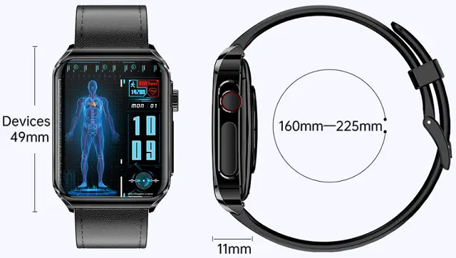 As you in the picture above, This new Rogbid Rowatch 7 got a square design that looks stylish, fashionable, and fits men and women. Measuring 49*38*11mm and weighing about 47g. There is one physical button on the right side of the case. It is responsible for the function of turning on the running. The reverse side of the device received a typical configuration – there are magnetic contacts for charging and a heart rate sensor.