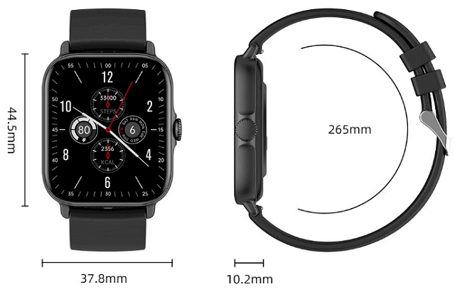 As you see in the picture above, This new Senbono GTS3 Pro watch comes in a square shape that looks stylish, sporty, and fits men and women. Measuring 44.5*37.8*10.2mm and weighing about 50g. There is one physical button on the right side of the case. It is responsible for the function of turning on the running. The reverse side of the device received a typical configuration – there are magnetic contacts for charging and a heart rate sensor.