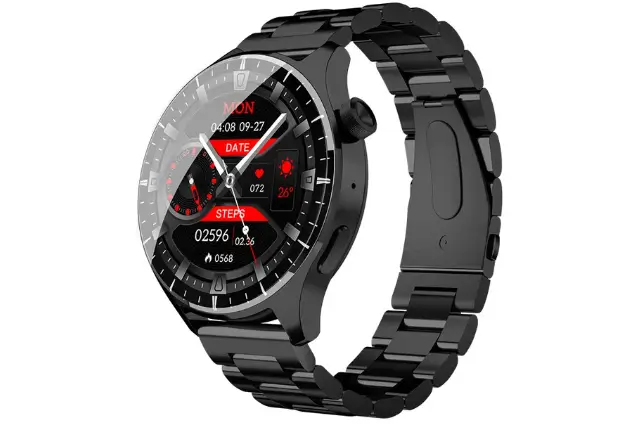 The SK32 smartwatch body is made of zinc alloy while the strap is available in silicone, steel, and leather. Regarding the display screen! This SK 32 smart watch has a 1.58-inch large IPS touchscreen curved with 2.5D glass and is created with a resolution of 466 x 466 pixels. This device is also packed with various watch faces and is available in black, silver, and brown colors.