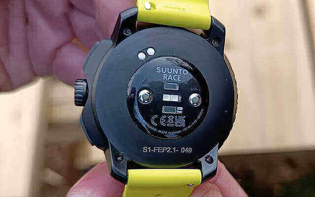 As you see in the photo above, This new Suunto Race watch got a circular design that looks stylish, fashionbale, and fits men and women. It measures 49 x 49 x 13.3 mm and weighs about 83g. There are three physical buttons on the right side of the panel. It is responsible for the function of turning on the running. The reverse side of the device received a typical configuration – these are magnetic contacts for charging and a heart rate sensor.
