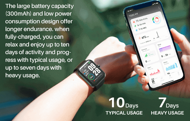 In addition to the features mentioned above, The Tozo S2 smartwatch can track up to 20 sports activities including walking, running, cycling, skipping, swimming, Rowing Machine, Cricket, and more. Additional Features are a Blood oxygen monitor, Female health monitoring, Call or messages reminder, App notification, Alexa voice assistance, and more. This device has a 300mAh battery capacity that can last 5-7 days with normal usage and 30 days of standby time.