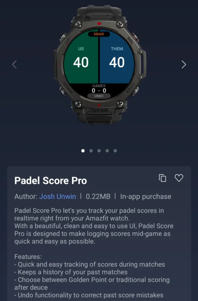 Fitness fans, specifically padel players, now have access to Padel Score Pro. This application is dedicated to tracking scores during matches directly on the watch face. Users should note, however, that while the app is available in the store, it does include optional in-app purchases for advanced features.