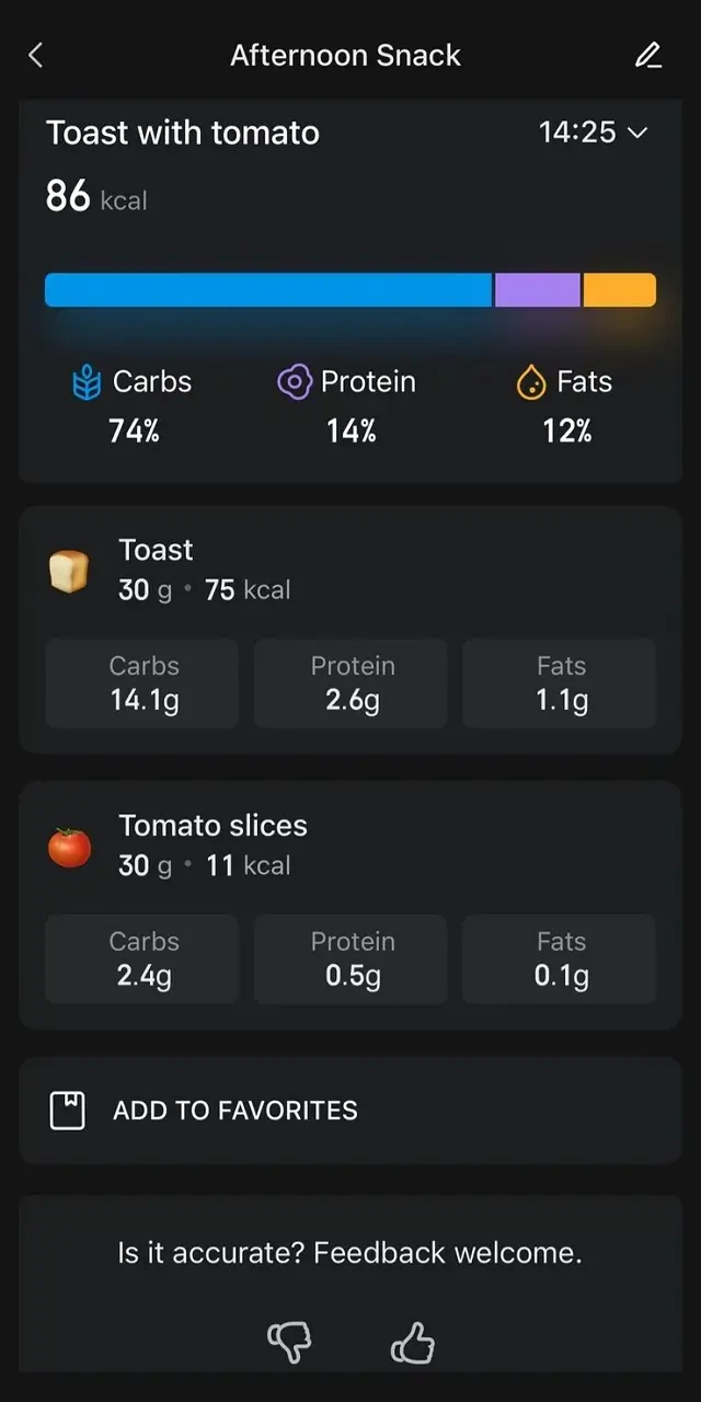 The new functionality makes it simple to save your frequently consumed food items. When you’re logging a meal—whether you use text, voice input, or the AI camera—you’ll now see an option to ‘Add to Favourites’ at the bottom of the screen.